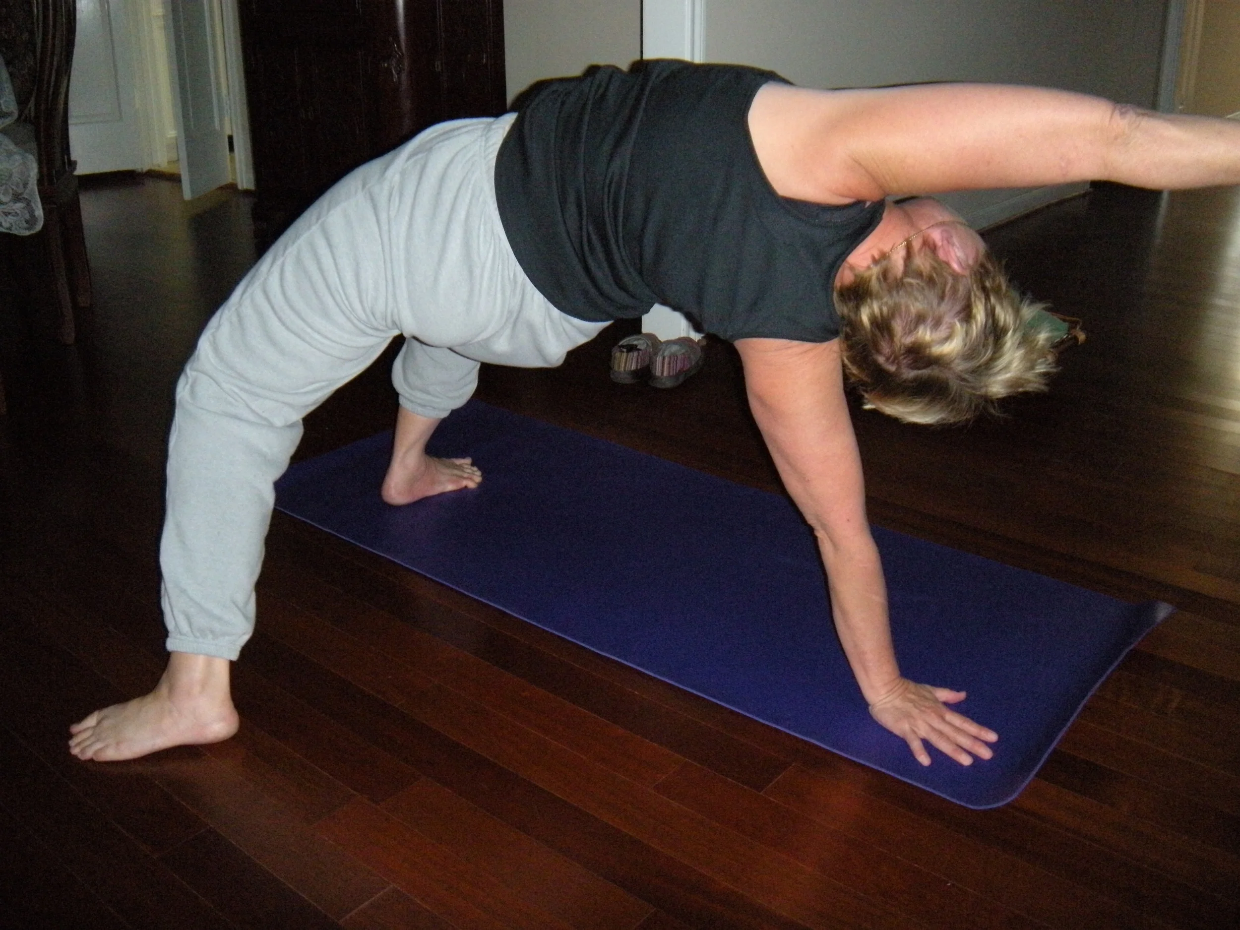 What a silly man. I tune him out, follow the flow, and think about my kitchen and bathroom counters at home, how they’re stacked with stuff that arrived two days ago in the shipment. Sweat pours from my head, runs into my eyes. Because of yoga I am flexible and strong. Back at the house I have a trunk load to take to Goodwill—pots and pans, bedding, extra laundry baskets. Towels. How did we accumulate so many mismatched towels?