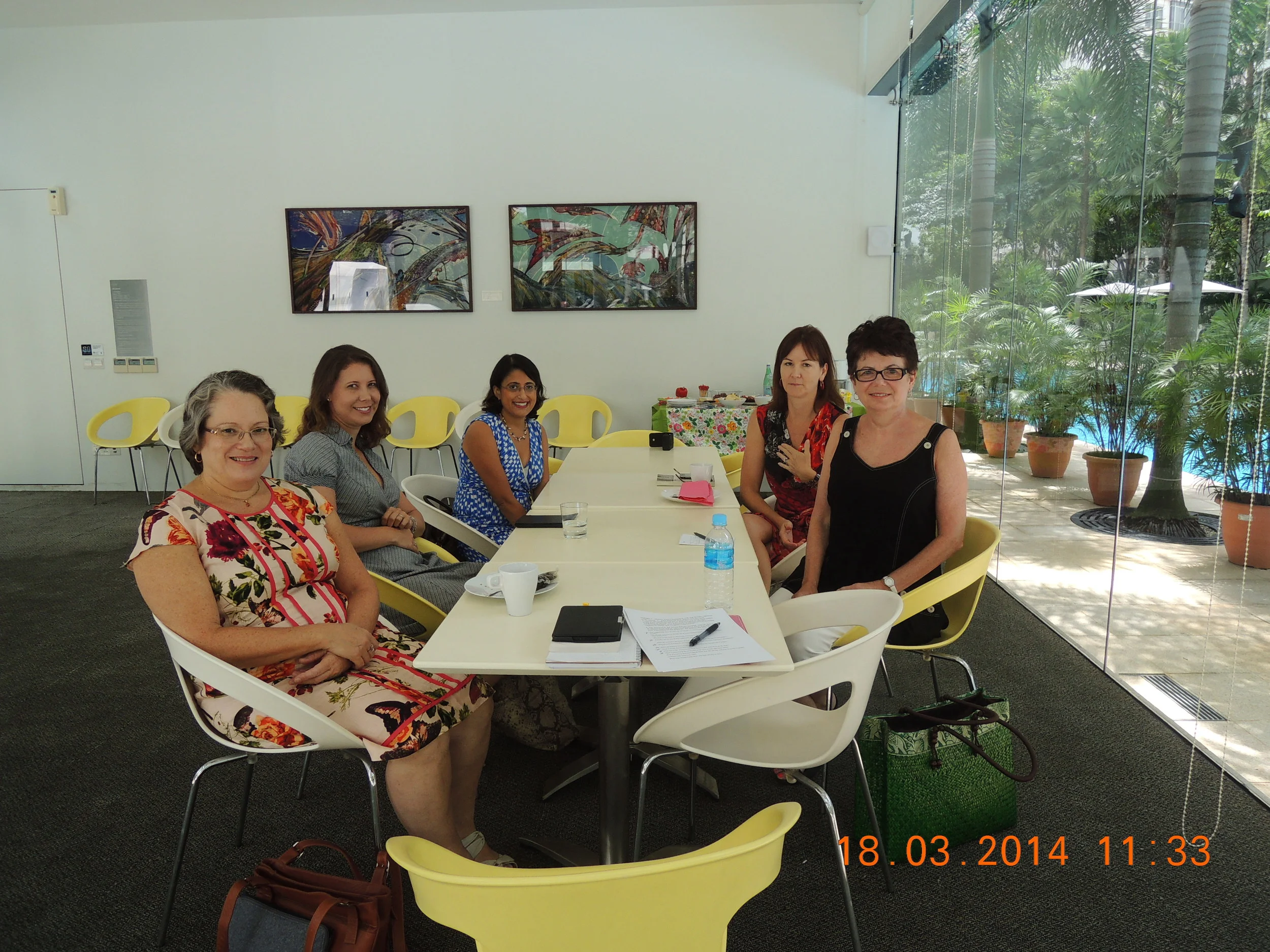 Judy, Beth, Sharmila, Kristen, and Donna--a good picture of you all! This is the meeting room in Donna's complex. At the back is a table full of goodies--thanks, Donna. The green bag on the floor next to Donna is mine.