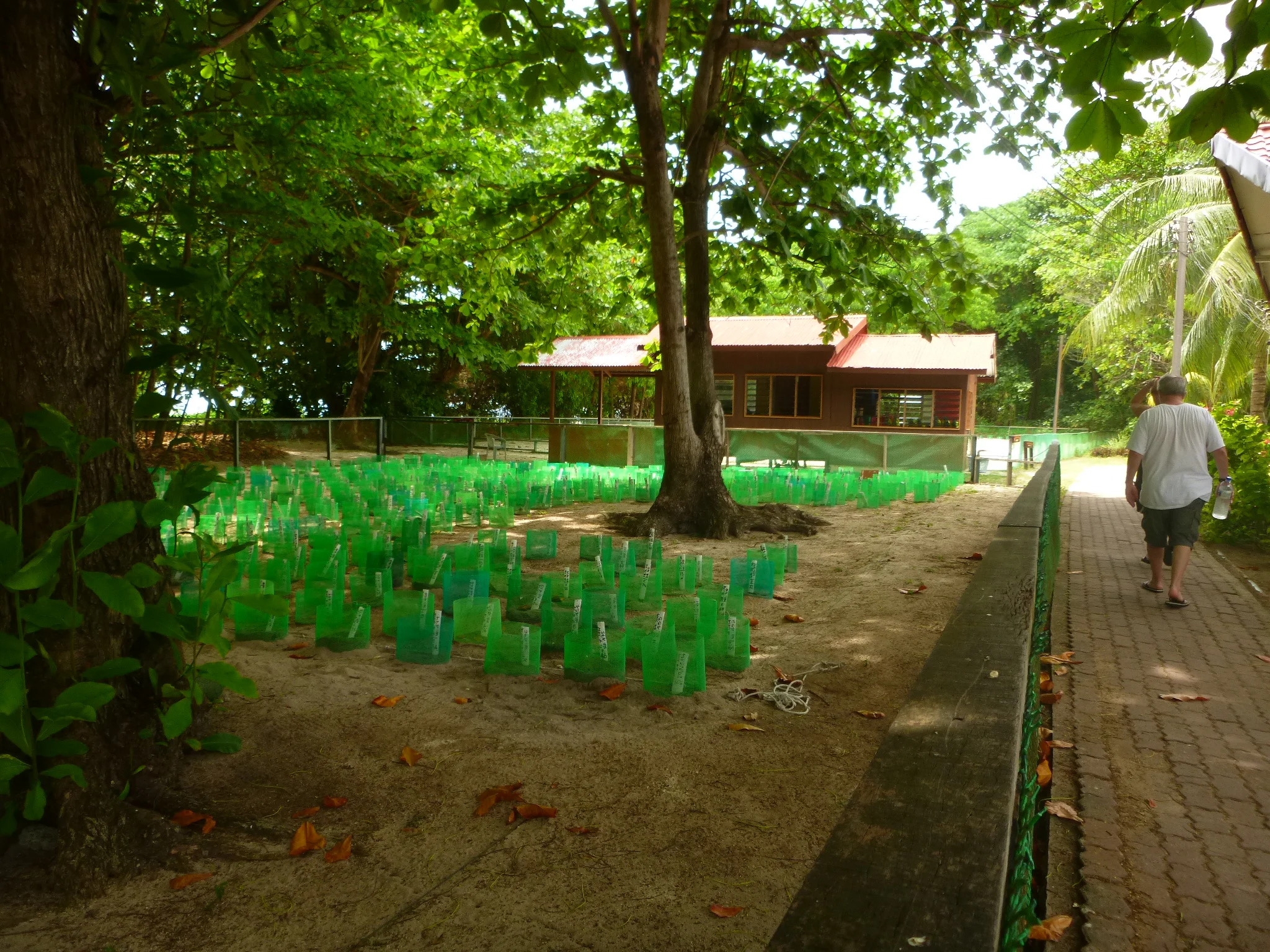 The green net cylinders are the protected nests.