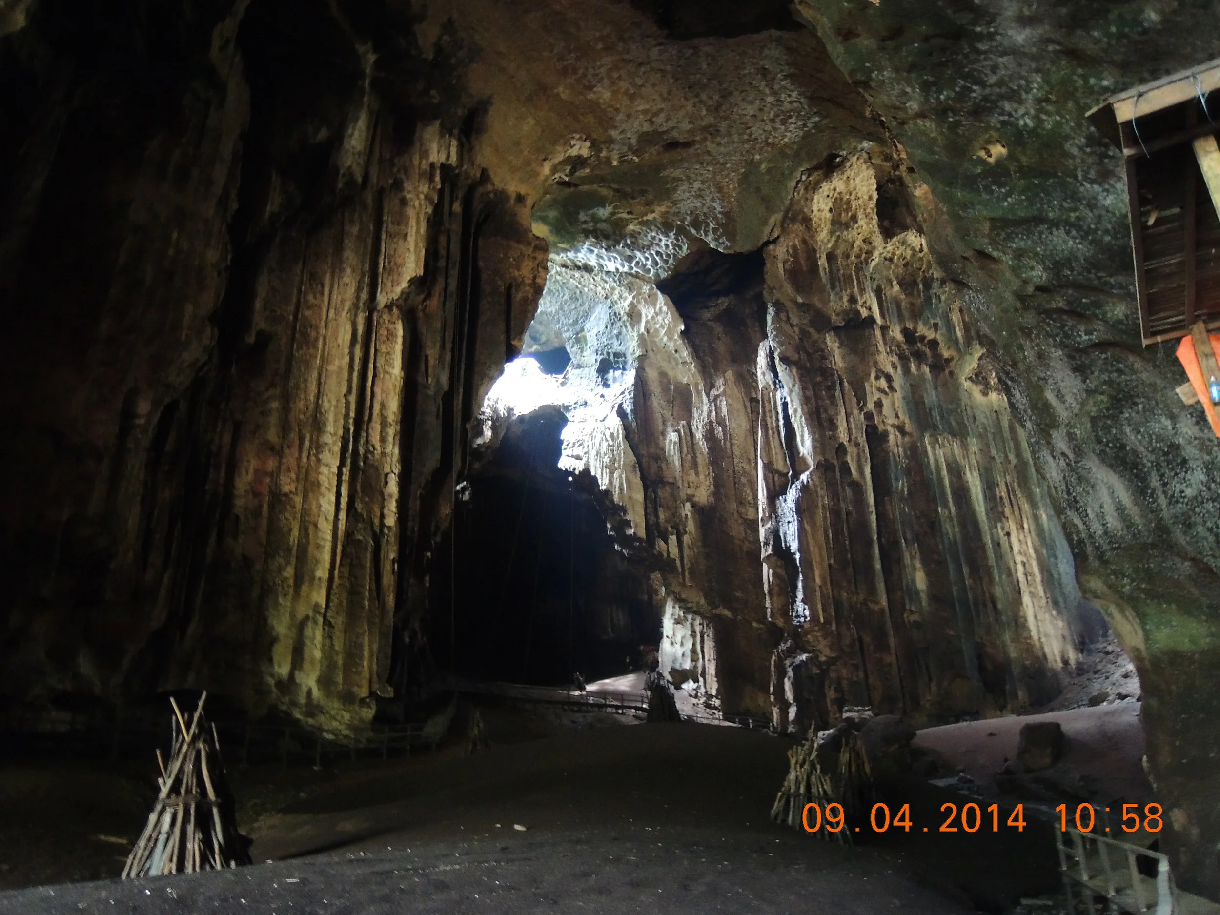 The mouth of the cave is huge and inviting. Foliage frames the shadowy portal, a picturesque grotto carved into a green hillside. It’s miserably hot out here in the humidity and scorching sun. It’ll be cool inside. People exit wearing hardhats, and this stirs a bit of anxiety—why were they issued head-coverings and we weren’t? The wooden bridge that leads to the cave crosses over shiny nasty sludge. We enter a massive chamber that soars to a height of about six stories and extends back about a hundred and thirty meters.