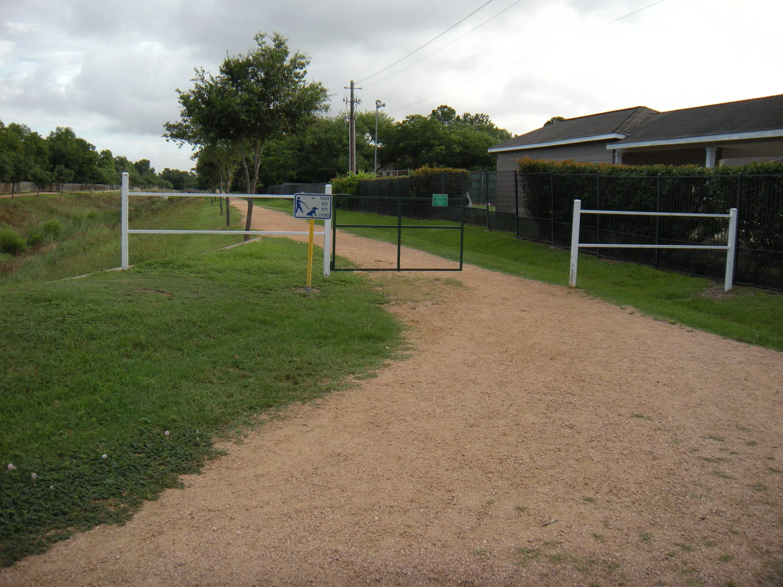 A frog, no larger than the nail of my thumb, hops across the path. Tiny frogs are cute. A couple and their dog ambles toward me. We exchange good mornings. A heron flaps and rises from the narrow muddy stream to my left. Considering the number of dogs out here, the place is pretty clean. Houston dog owners are polite. Oh, and look, some kind master has cut a square hole in his fence so his dog can observe the comings and goings on the trail. Hello dog.