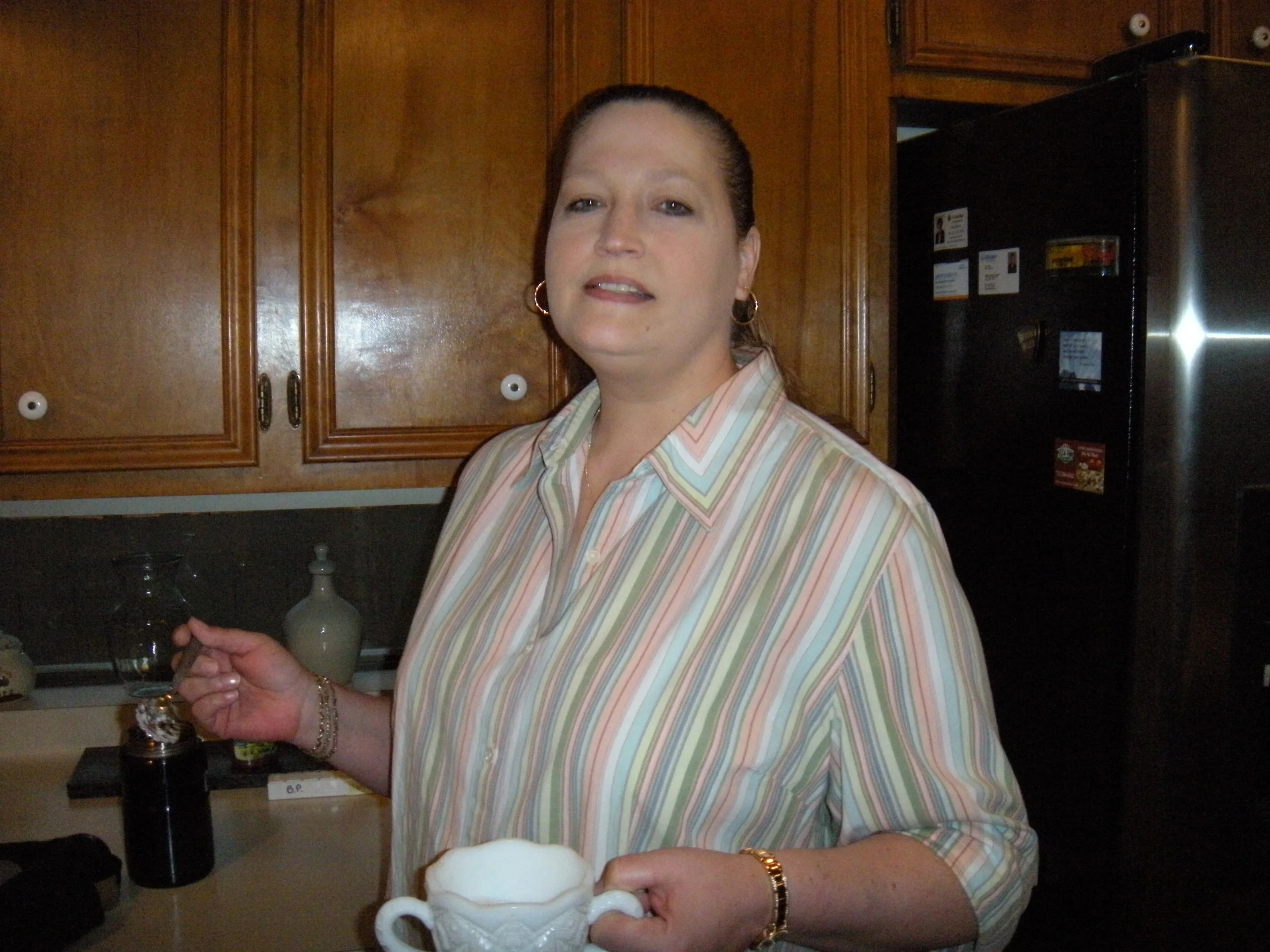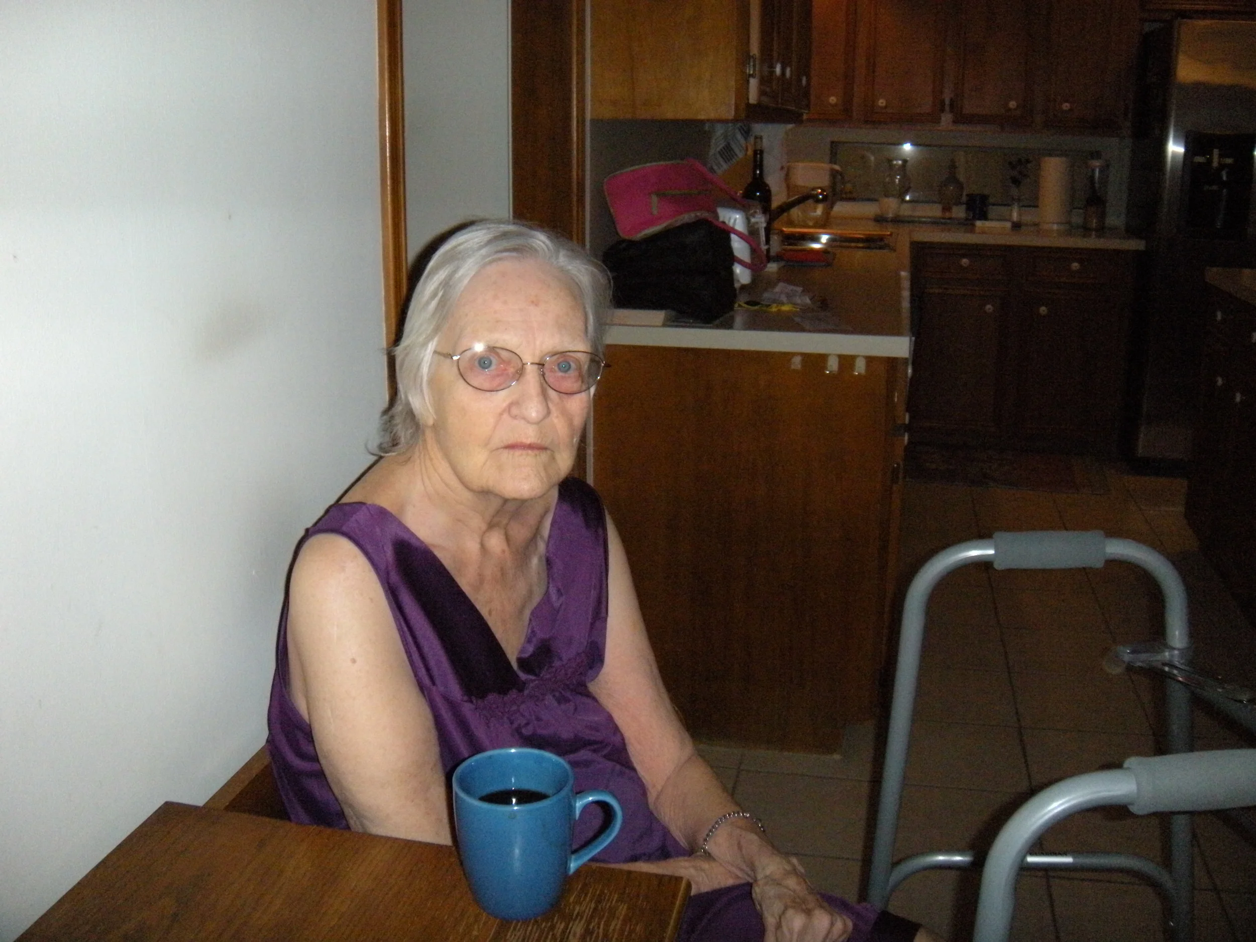 Momma and her coffee. The corked wine in the background is mine.