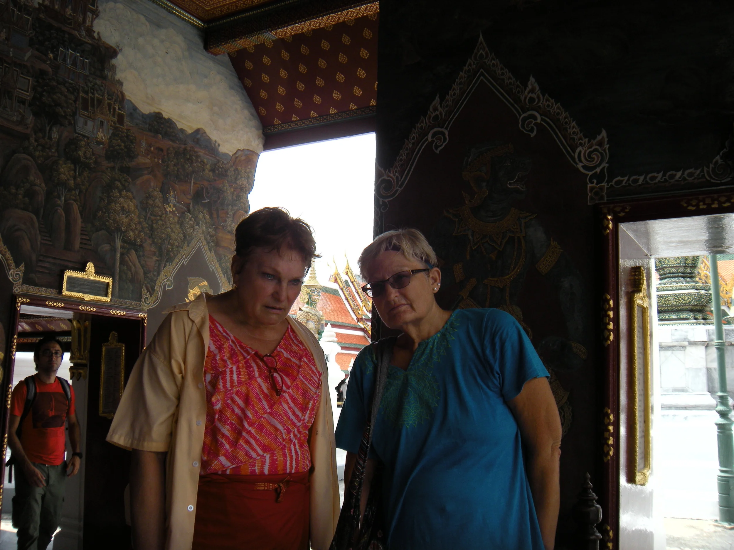 Last time I was at the Grand Palace, acceptable attire for women was cropped jeans and a wrap to cover bare shoulders. I looked it up before I dragged Resi and Georgia here, just to be sure—and the website I found indicated that nothing has changed. But when we get here a little man judges Georgia and I to be not quite decent enough. Georgia’s pants show two inches too much calf, and our thin shawls simply won’t conceal our exquisite pearly shoulders. He waves us over to the side, to the line where, for only a two hundred Baht deposit, we’re able to borrow shirts for both of us and a wrap-around skirt for Georgia.