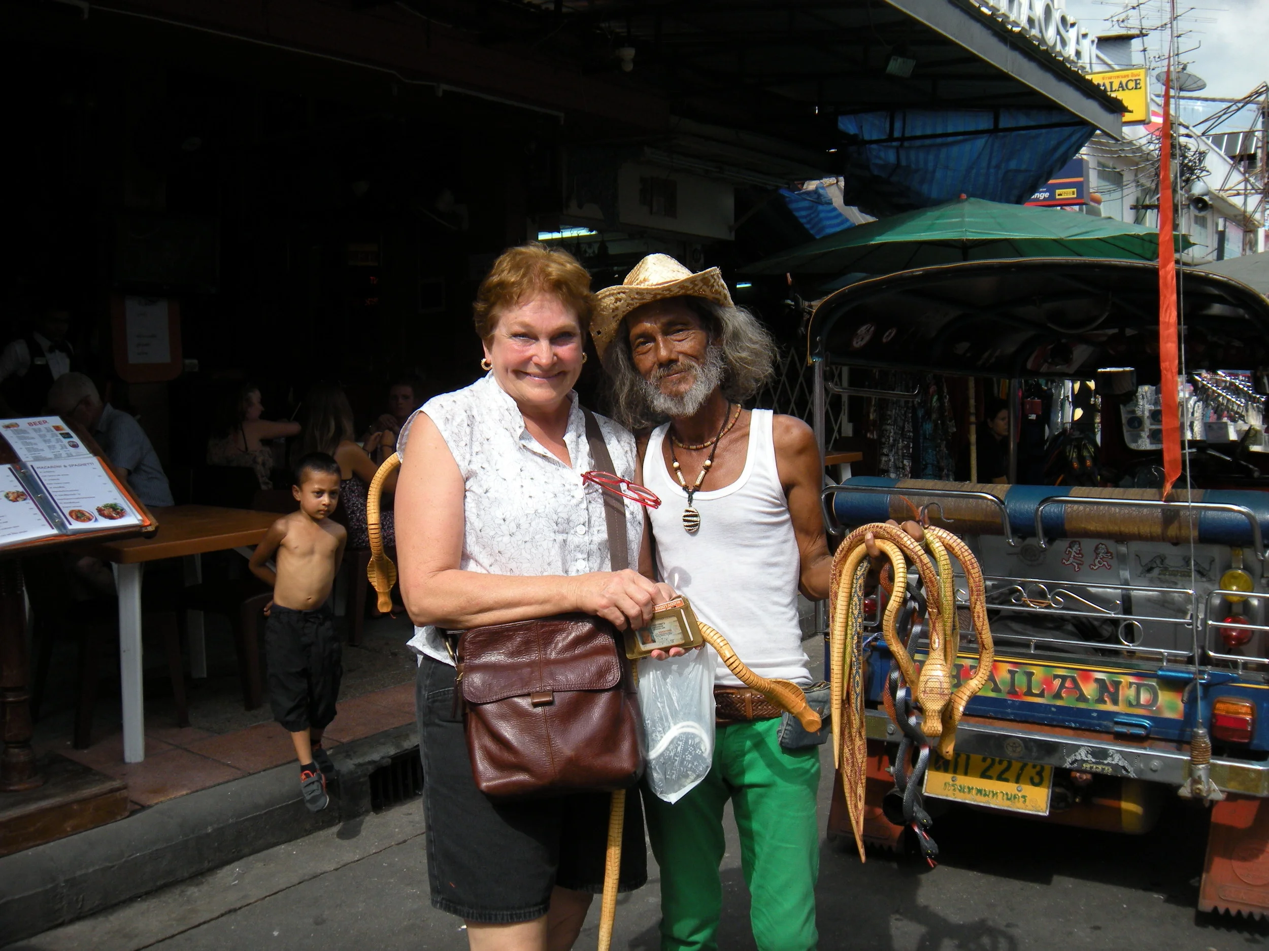 The heat hits Georgia hard. Wearing two layers of cotton, the top layer heavy and impermeable, she’s red-faced and dripping before we even enter the temple area, too miserable to appreciate the history and magnificence of the colorful temples. (Inserting my opinion—burdened by an overwhelmed infrastructure, Bangkok does an extraordinary job of caring for its main attraction. The pavements of the Grand Palace are spotless, the reflective surfaces of the elaborate spires twinkle, brightly clean; and the renovation work, which is ongoing, is unobtrusive and reveals dedication and generous funding.) Resi, too, is suffering. Hot and exhausted, her knees are hurting, and every other step involves an up or down stair.