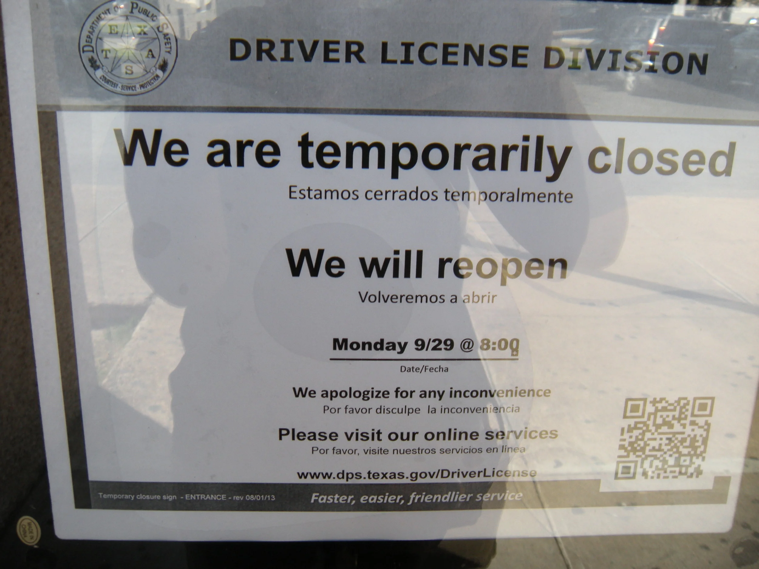Skeptical, I step forth and read. Yep. Closed today, reopening next week. If driver’s licenses are compulsory, shouldn’t there be someone to issue them? Don’t the people of the DPS know they’re losing valuable customers?