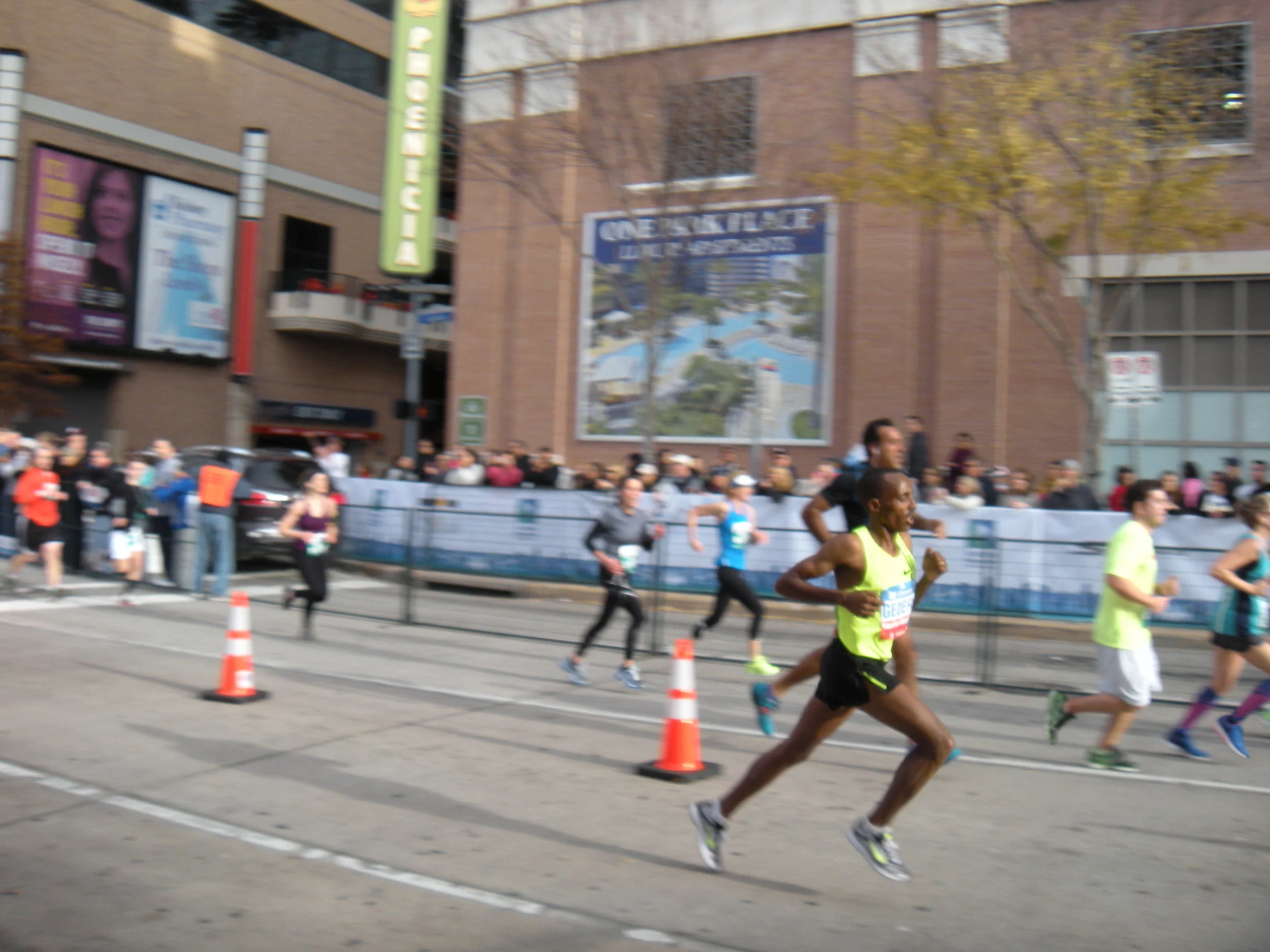 Our timing couldn’t be better. We find a perfect position at the barrier near the finish line just as the frontrunners are entering the home stretch. Music with a strong beat vibrates through the air and an announcer’s enthusiastic voice goes on and on and on. Cheering people line the barrier as, in the street, the athletes pound by, or scuff by, depending on their level of stamina. Some of them look comfortable. Quite a few are fighting their way through obvious fatigue, struggling to put one foot in front of the other.
