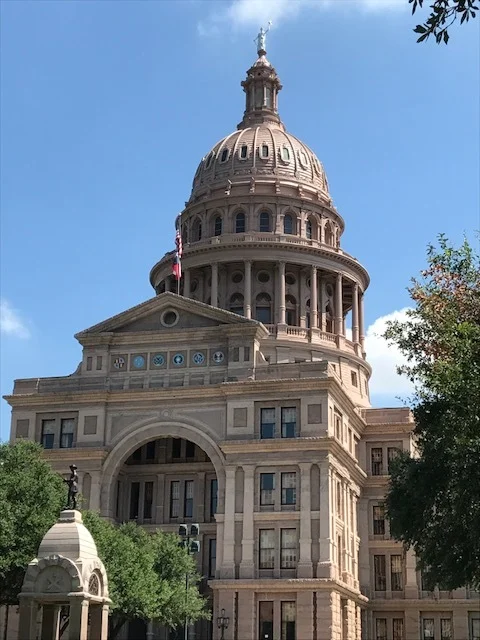 The next morning we take a sweaty walk up Eleventh, through the grounds of the capitol, which contains monuments to represent every historical event and the three ethnic groups that influenced Texas history (Latino, Caucasian, African American; sorry, Asians, you weren’t here yet). I take a picture of the statue of the longhorns because I’m currently writing a novel about a longhorn stampede, a happy coincidence.