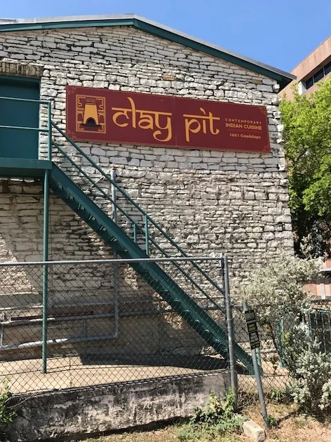 He has made a reservation for Saturday night at The Clay Pit. Parking is always a problem in Austin and this restaurant that holds a hundred people provides only ten parking places. We park two blocks away and it’s raining outside; but it’s a light rain, we have umbrellas, and walking is good for the soul. If we’d driven around more we would have seen the parking garage right across the street.